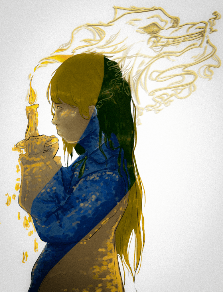 .⋆。⋆༶⋆˙⊹ This piece started out as just a sketch—a throwaway doodle that would forever be incomplete. I left it like this for several months until I opened Procreate again, and realized its potential. I painted the girl in thick blotches with a yellow and blue color palette, similar to Van Gogh’s Starry Night. The wolf was inspired by artist Mulan Fu, whose surrealist work centers on cultural identity, animation, and storytelling. A common creature she depicts is a harrowing wolf which resembles a dragon. I admire Fu’s sense of flow that effortlessly streams from one point to the next. Taking this as inspiration for own piece, the wolf is drawn seamlessly emerging from the candle, its wisps flowing back into the girl’s ear to symbolize a connection from within.